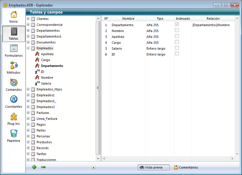 Además de los números, nombres y tipos de campos de la tabla seleccionada, también se listan los índices asociados a la tabla (sin importar su tipo) como también las relaciones que se originan en la