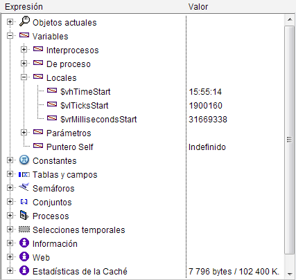 Lista los conjuntos definidos en el proceso actual (el que usted está depurando actualmente); así como también los conjuntos interproceso. Para cada conjunto, la columna valor muestra el número de registros y el nombre de la tabla. Esta lista puede estar vacía si usted no utiliza conjuntos. Las expresiones de este tema no pueden modificarse.