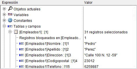 Este tema lista las tablas y campos en la base de datos; no lista los subcampos. Para cada tabla, la columna valor muestra el tamaño de la selección actual para el proceso actual así como también (si la línea de la tabla está desplegada) el número de registros bloqueados. Para cada campo, la columna valor muestra el valor del campo (a excepción de imágenes, subtablas y BLOBs) para el registro actual, si lo hay. En este tema, los valores de los campos pueden modificarse (no es posible deshacer una acción), pero la información de la tabla no.