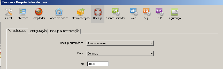Os parâmetros de backups programados são definidos na página Página Backup/Periodicidade do banco.
