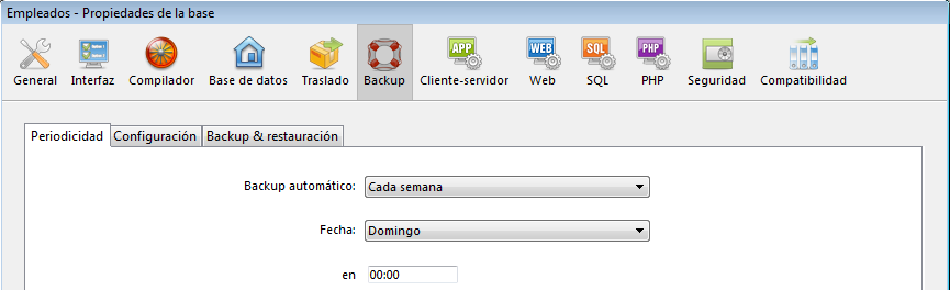Los parámetros de backups programados se definen en la Página Backup/Periodicidad de las Propiedades de la base: