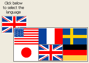 ピクチャーメニューを作成するには、画像を参照する必要があります。次の例は、ピクチャーボタンのために定義されたピクチャーを使用しています (ピクチャーボタン参照)。この場合、ピクチャーポップアップメニューからピクチャーを選択することにより、インタフェース言語を選ぶことができます。各言語は対応する国旗で表わされます: