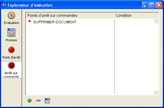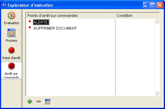 La liste des Points d'arrêt sur commandes est une page de l'Explorateur d'exécution qui vous permet d'ajouter des points d’arrêt supplémentaires dans votre code en interceptant des appels aux commandes 4D.
