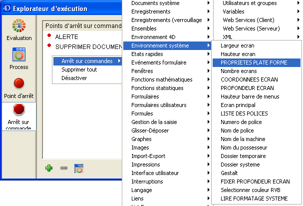 Cliquez dans la liste avec le bouton droit de la souris pour afficher un menu contextuel. Sélectionnez Arrêt sur commande, le menu liste alors toutes les commandes 4D :