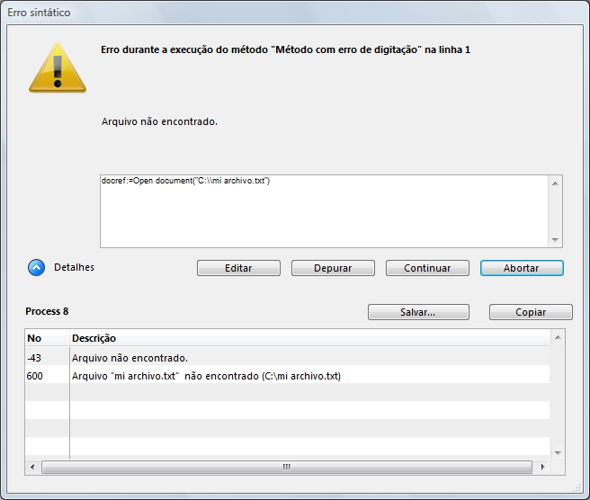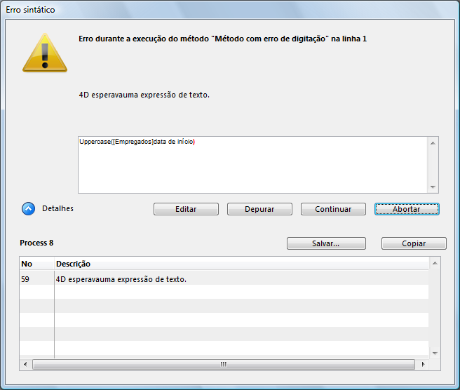 Nesta janela, o erro é que um nome de tabela é passado para o comando , que espera uma expressão de texto. Para saber mais sobre esta janela e seu botão, consulte a seção Janela de erro de sintaxe. Na foto acima, a área "Detalhes" é expandida para mostrar o último erro e seu número.