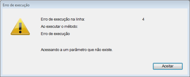 Alguns erros podem ser detectados somente quando você executar o método. A Janela de erro de sintaxe é exibida quando ocorre um erro. Por exemplo: