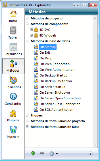 El Explorador es una ventana del entorno Diseño que centraliza los accesos a las tablas, formularios, métodos, comandos, constantes y plug-ins y ofrece información sobre estos elementos. Puede mostrar el Explorador en cualquier momento eligiendo una de las páginas en el submenú Diseño > Explorador o haciendo clic en el botón Explorador de la barra de herramientas.