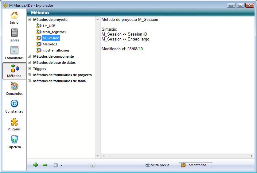 Puede mostrar u ocultar el área de vista previa del Explorador haciendo clic en el icono de desplegar o de contraer el área de vista previa . La ventana de vista previa le permite visualizar las tablas y campos, los formularios, los métodos, la documentación de los comandos, los valores de constantes, así como también la información sobre los componentes y plug-ins instalados en la base. También puede utilizar el área de vista previa para añadir y ver comentarios sobre ciertos objetos de la base.