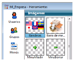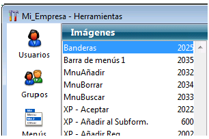 La ventana de la librería de imágenes muestra la lista de imágenes almacenadas en la base. Incluyendo los comandos de gestión de imágenes como también una barra de herramientas para editar el contenido de las imágenes: