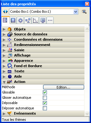 Le glisser-déposer automatique peut être paramétré séparément pour chaque objet d'un formulaire via deux options de la Liste des propriétés : Glisser automatique et Déposer automatique :