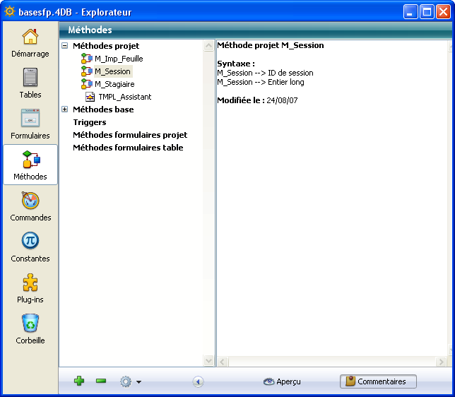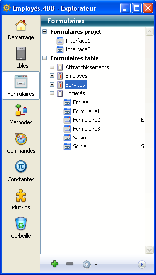 Les boutons situés sur la gauche de l’Explorateur vous permettent d’accéder aux différentes pages d’objets du mode Développement. L’Explorateur possède des pages séparées pour les tables, formulaires, méthodes, commandes, constantes et plug-ins.