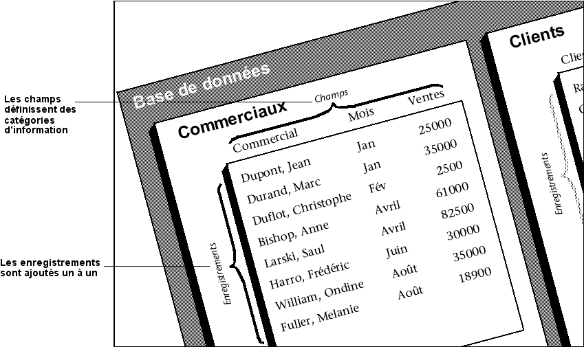 Les informations dans une base sont organisées sous la forme d’enregistrements. Chaque enregistrement contient toutes les informations sur une personne ou un “élément” de la base. Par exemple, chaque enregistrement dans un carnet d’adresses contient le nom d’une personne, son adresse et son numéro de téléphone.