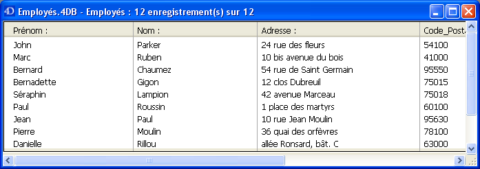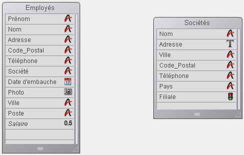 La table [Employés] contient un enregistrement par personne. La table [Sociétés] contient un enregistrement par société. La relation entre les deux tables permet de visualiser, saisir, modifier et supprimer des données des deux tables. Par exemple :
