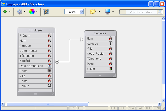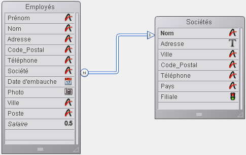 L’exemple ci-dessous montre un lien entre la table [Employés] et la table [Sociétés], affiché dans l’éditeur de structure :