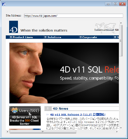 WebエリアはあらゆるタイプのWebコンテンツを4D環境で表示します。静止画や動画を含むHTMLページ、ファイル、ピクチャ、Javascript、Flash、PDFそしてMS Officeドキュメント (MS OfficeがインストールされているWindowsのみ) などです。以下のピクチャはフォームに格納されているWebエリアで、HTMLページを表示しています。