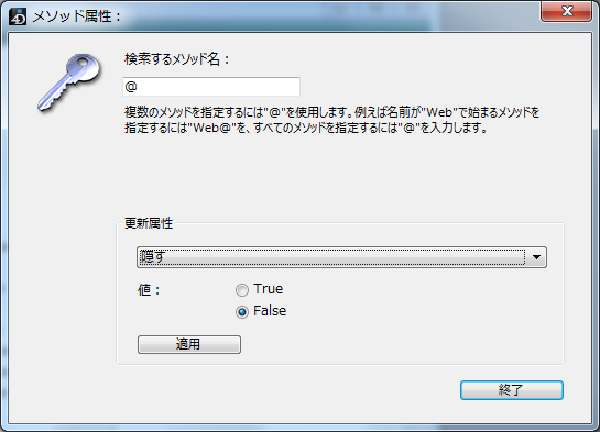 エクスプローラーのCurrent form table のツールメニューから属性一括設定... コマンドを選択します。 "メソッド属性"ダイアログボックスが表示されます: "検索するメソッド名"エリアに属性を一括設定するメソッドを決定するための名前条件を入力します。 入力した文字列を使用してメソッド名が検索されます。 "@"をワイルドカード文字として使用し、メソッドグループを選択できます。すべてのメソッドを選択するには"@"のみを入力します。 注:大文字と小文字は区別されません。 "@"は複数回使用できます (例: "dtro_@web@pro@") "更新属性"エリアではドロップダウンリストから更新対象の属性を選択し、True または False ラジオボタンを選択します。注: "WSDLとして公開"属性をTrueに設定しても、この属性は"Webサービスとして公開"属性がTrueに設定されたメソッドにのみ適用されます。 適用 をクリックします。 属性変更は検索条件に合致するメソッドに対し、即座に反映されます。