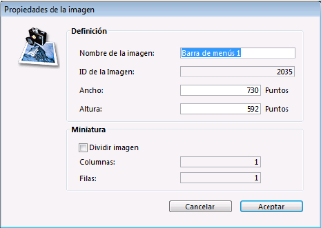 • ID de la imagen: número de ID único para la imagen. Este es el número de referencia de la imagen que utiliza cuando crea botones imagen, menús imagen desplegables, barras de herramientas personalizadas, listas o cuando maneja las imágenes de la librería por programación.