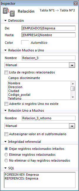 El área SQL del Inspector ofrece información útil para trabajar con la estructura vía el lenguaje SQL. Para las relaciones, el área indica las propiedades FOREIGN KEY y REFERENCES.