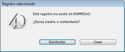 Advertir si registro Uno no existe: si esta opción está seleccionada, 4D muestra una caja de diálogo que permite al usuario crear el registro Uno relacionado si no existe. Por defecto, cuando introduce un valor en un campo relacionado de la tabla Muchos, 4D verifica si existe un registro correspondiente en la tabla Uno relacionada. Si 4D no lo encuentra, aparece la siguiente caja de diálogo: Esta caja de diálogo permite crear un registro correspondiente en la tabla Uno mientras introduce un registro en la tabla Muchos. Por ejemplo, imagine que su base contiene una tabla [Facturas] y una tabla [Clientes]. Si introduce una factura en la tabla [Facturas] y el cliente a quien está destinada la factura no tiene un registro correspondiente en la tabla [Clientes], 4D le pedirá si quiere crear el registro correspondiente en la tabla [Clientes] cuando valide el registro de la tabla [Facturas]. Puede eliminar esta caja de diálogo deseleccionando la opción Advertir si registro Uno no existe. Eliminar esta caja de diálogo es útil cuando quiere gestionar la creación del registro Uno relacionado utilizando un método.