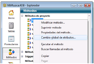 En la Current form table del Explorador 4D, haga clic derecho, luego elija el comando Cambio global de atributos... Aparece la caja de diálogo “Atributos de métodos”: