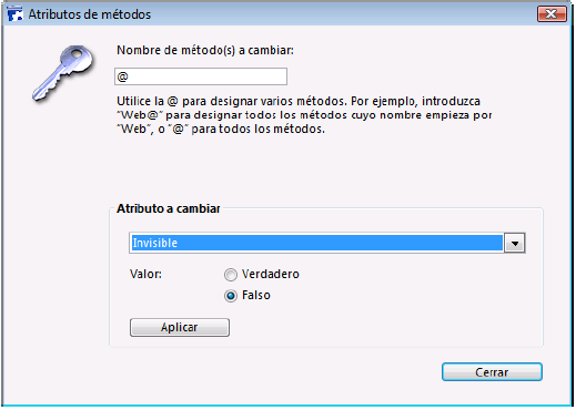 En el área “Atributo a cambiar”, elija un atributo de la lista desplegable, luego haga clic en el botón de radio Verdadero o Falso correspondiente al valor aplicado. Nota: si el atributo “Publicado en WSDL” es definido como Verdadero, sólo se aplicará a los métodos de proyecto que contengan el atributo “Ofrecido como Servicio web”.