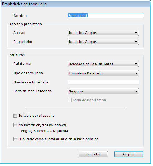 La mayoría de las propiedades en esta caja de diálogo (nombre, acceso, plataforma, etc.) también pueden definirse en la Lista de propiedades del editor de formularios y se describen en la sección Propiedades de los formularios. Sin embargo, la propiedad "Publicado como subformulario en la base local" (descrita a continuación) se encuentra en esta caja de diálogo.