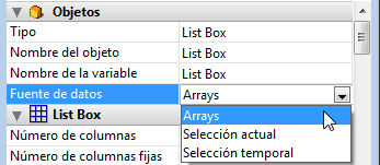 Seleccione la opción Arrays si quiere utilizar elementos del array como líneas del list box. La opción arrays es necesaria si quiere recuperar el resultado de una petición SQL en un list box (ver la sección Visualización del resultado de una petición SQL en un list box).