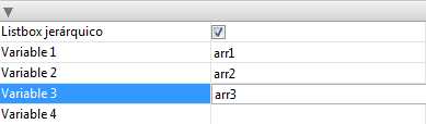 Variable 1 ... 10: estas opciones adicionales aparecen cuando la opción List box jerárquico está seleccionada. Cada vez que se introduce un valor en un campo, se agrega una nueva fila. Se pueden especificar hasta 10 variables. Estas variables definen los niveles jerárquicos que se mostrarán en la primera columna. La primera variable siempre corresponde al nombre de la variable de la primera columna del list box (los dos valores se enlazan automáticamente). Esta primera variable es siempre visible y editable. Por ejemplo: país. La segunda variable es siempre visible y editable, especifica el segundo nivel jerárquico. Por ejemplo: regiones. Empezando con el tercer campo, cada variable depende de la que le precede. Por ejemplo: departamentos, ciudades, etc. Se pueden especificar un máximo de diez niveles jerárquicos. Si elimina un valor, toda la jerarquía se mueve un nivel. La última variable nunca es jerárquica, aunque varios valores idénticos existan en este nivel. Por ejemplo, en referencia a la configuración ilustrada anteriormente, imagine que arr1 contiene los valores A A A B B B, arr2 tiene los valores 1 1 1 2 2 2 y arr3 los valores X X Y Y Y Z. En este caso, A, B, 1 y 2 podría aparecer en forma contraída, pero no X y Y: + A + 1 X X Y + B + 2 Y Y Z Este principio no se aplica cuando una sola variable se especifica en la jerarquía: en este caso, los valores idénticos se pueden agrupar. Nota: si especifica una jerarquía basada en las primeras columnas de un list box existente, debe entonces borrar u ocultar estas columnas (excepto la primera), de lo contrario, aparecerán dos veces en el list box. Si define la jerarquía a través del menú emergente del editor (ver DOM Find XML element by ID), las columnas innecesarias se eliminan automáticamente del list box.