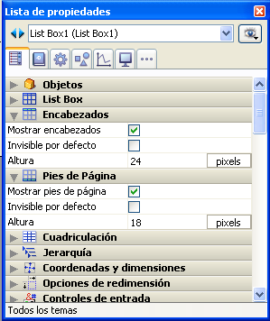Mostrar encabezados y Mostrar pies: permite mostrar u ocultar los encabezados o los pies de las columnas. No hay otras opciones disponibles en cada tema a menos que esta propiedad esté seleccionada. Una vez el área se muestra en el list box, puede seleccionarla haciendo clic en ella para acceder a sus propiedades específicas en la Lista de propiedades (ver Propiedades específicas de los encabezados de list box y Propiedades específicas de los pies de list box). Usted dispone de un área de encabezado y de un área de pie por columna, configurables por separado.