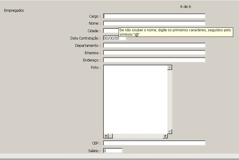 Quando o usuário colocar o ponteiro do mouse debaixo de um campo, aparece a mensagem em uma mensagens de ajuda, como se mostra a seguir.