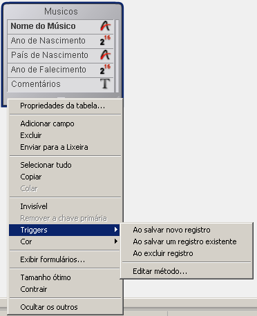 Os eventos triggers podem ser configurados em Inspetor ou através do menu contextual associado com a tabela (clique direito na área de título da tabela):