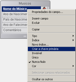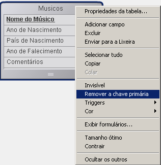 É possível criar e eliminar as chaves primárias diretamente utilizando o menu contextual (botão direito do mouse) do editor de estrutura.
