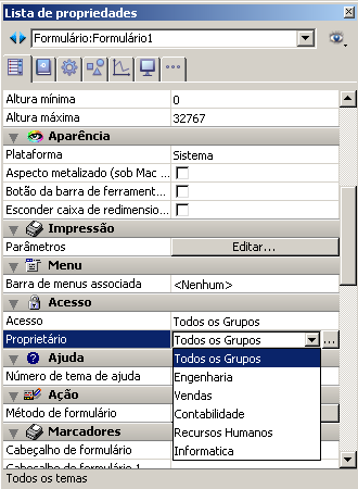 Pode controlar o acesso a um formulário estabelecendo os privilégios de Acesso e Proprietário para os grupos de usuários. Apenas pode associar um grupo de usuários a cada privilégio usando as listas de Acesso e Proprietário. Para mais informação sobre a criação de um sistema de acesso por senhas com usuários e grupos, consulte o capítulo Usuários e grupos.