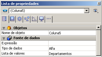 Em modo Desenho, o tipo de fonte de dados é mostrado na primeira linha da coluna. Por exemplo, Campo=[Tabela1]MeuCampo. Se a expressão definida estiver incorreta, a coluna do list box mostrará uma mensagem de erro no modo Aplicação.