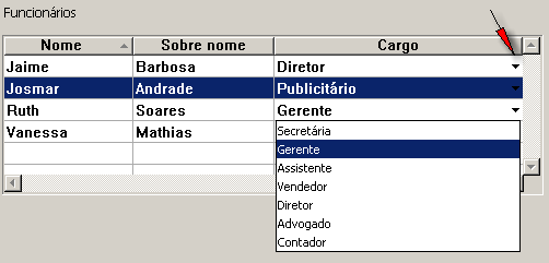 Lista de seleção: esta propriedade pode ser utilizada para associar uma Lista de valores a uma coluna do list box. Se você desenha uma lista, o usuário pode utilizar seus valores (mostrados em um menu suspenso) para modificar os valores da coluna e seu array associado: