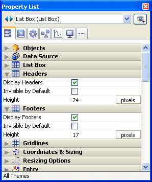 Mostrar cabeçalhos e Mostrar rodapés: permite mostrar ou ocultar os cabeçalhos ou os rodapés das colunas. Não há outras opções disponíveis em cada tema a menos que esta propriedade esteja selecionada. Uma vez a área se mostre no list box, pode selecionar fazendo clique nela para entrar a suas propriedades específicas na Lista de propriedades (ver Propriedades específicas dos títulos de list box e Specific properties of List box footers). Você dispõe de uma área de cabeçalho e de uma área de rodapé por coluna, configuradas por separado.