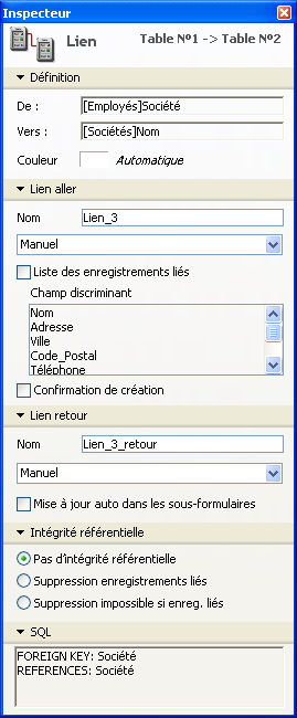 La zone SQL de l’Inspecteur fournit des informations utiles en cas d’exploitation de la structure via le langage SQL. Pour les liens, la zone indique les propriétés FOREIGN KEY et les REFERENCES.