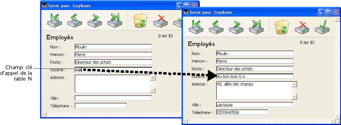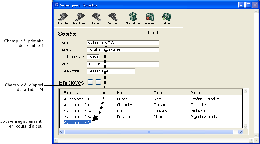 soit manuellement, si le champ clé est affiché : dans l’exemple précédent, il suffit de saisir “Au bon bois S.A.” dans le champ Société de chaque sous-enregistrement,