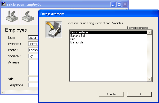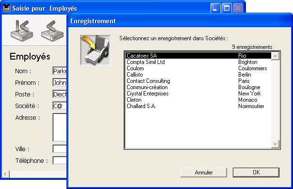 Champ discriminant La liste des champs discriminants vous permet de sélectionner un champ supplémentaire qui sera affiché dans la liste des valeurs (qui apparaît lorsque l’utilisateur saisit le joker @ dans le champ lié lors de la saisie). Généralement, il est souhaitable de sélectionner le champ qui identifie le mieux l’enregistrement. Voici comment fonctionne cette option en cours de saisie : 4D permet à l’utilisateur de consulter les valeurs de la table 1 lorsqu’il saisit des données dans le champ d’appel de la table N. L’utilisateur place simplement le caractère standard “joker” (@) dans le champ lié. Dans ce cas, 4D recherche des valeurs correspondantes dans la table 1 liée. Le Joker peut être utilisé de deux manières : pour compléter une saisie partielle ou pour afficher la liste des valeurs valides. Lorsqu’une liste est affichée, l’utilisateur peut y sélectionner une valeur. Un champ supplémentaire, le champ discriminant, peut être affiché avec le champ lié. Supposons que l’utilisateur soit en train de créer un enregistrement dans la table [Employés]. Plutôt que de saisir “Au bon bois S.A.” en toutes lettres dans le champ Société, l’utilisateur peut saisir A@ puis appuyer sur la touche Tabulation pour passer au champ suivant. Comme le caractère @ est le caractère joker de 4D, cette saisie a la signification suivante : “la valeur commence par un A et peut être suivie de tout caractère”. 4D recherche dans la table liée l’enregistrement qui correspond à ce critère. S’il en trouve un, il complète la saisie et sélectionne le champ suivant dans l’ordre de saisie. Les écrans ci-dessous illustrent ce type d’utilisation du joker. Si 4D trouve plus d’une valeur qui correspond au critère, il affiche une liste de valeurs afin que l’utilisateur puisse sélectionner celle qui lui convient : Vous pouvez spécifier un second champ qui sera affiché dans la liste pour aider l’utilisateur à choisir la société qu’il doit sélectionner. Le deuxième champ est le champ discriminant que vous avez sélectionné dans la boîte de dialogue de définition de type du lien. La figure ci-dessous représente la liste des sociétés ainsi que leur localisation. Ce champ discriminant aide l’utilisateur qui ne sait pas si la société s’appelle Callisto ou Crystal mais qui se souvient que cette société est basée à Berlin : La fenêtre de choix d’enregistrement peut être redimensionnée. Pour visualiser la liste de toutes les sociétés de la table [Sociétés], il suffit de ne saisir que le caractère @. 4D affiche alors la liste complète de toutes les sociétés de la table afin que l’utilisateur puisse sélectionner celle qui convient.