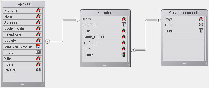 Si votre base possède plusieurs tables liées, le contrôle d’intégrité référentielle est activé comme dans une chaîne. Par exemple, supposons que la structure de votre base soit celle qui est représentée ci-dessous. Si un Pays est supprimé dans la table [Affranchissements] (une table 1) et que l’option Suppression enregistrements liés est sélectionnée pour chaque lien, 4D supprime tout d’abord les enregistrements correspondants dans la table [Sociétés], puis dans la table [Employés] tous les enregistrements des employés de ces sociétés.