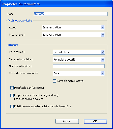 La plupart des propriétés contenues dans cette boîte de dialogue (nom, accès, plate-forme, etc.) peuvent également être définies dans la Liste des propriétés de l'éditeur de formulaires. Elles sont décrites dans la section Propriétés des formulaires. Seule la propriété "Publiée comme sous-formulaire dans la base hôte" (décrite ci-dessous) n'est accessible que dans cette boîte de dialogue.