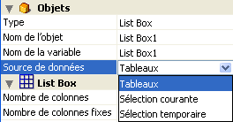 Sélectionnez l’option Tableaux si vous souhaitez utiliser des éléments de tableaux comme lignes de la list box. L’option Tableaux est nécessaire si vous souhaitez pouvoir récupérer le résultat d’une requête SQL dans la list box (cf. section Affichage du résultat d’une requête SQL dans une List box).
