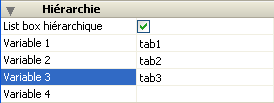 Variable 1 ... 10 : ces options supplémentaires apparaissent lorsque l’option List box hiérarchique est cochée. A chaque saisie d’une valeur dans une option, une nouvelle ligne est ajoutée. Jusqu’à 10 variables peuvent être définies. Ces variables définissent les niveaux hiérarchique à afficher dans la première colonne. La première variable correspond toujours au nom de variable de la première colonne de la list box (les deux valeurs sont automatiquement liées). Cette première variable est toujours visible et saisissable. Par exemple : pays. La seconde variable est également toujours visible et saisissable, elle définit le deuxième niveau hiérarchique. Par exemple : régions. A partir du troisième champ, chaque variable dépend de celle qui la précède. Par exemple : départements, villes, etc. Un maximum de dix niveaux hiérarchiques peut être défini. Si vous effacez une valeur, l’ensemble de la liste hiérarchique définie remonte d’un niveau. La dernière variable n’est jamais hiérarchique même si plusieurs valeurs identiques existent à ce niveau. Par exemple, en reprenant la configuration illustrée ci-dessus, imaginons que tab1 contienne les valeurs A A A B B B, tab2 les valeurs 1 1 1 2 2 2 et tab3 les valeurs X X Y Y Y Z. Dans ce cas, A, B, 1 et 2 pourront apparaître sous forme contractée, mais pas X et Y : + A + 1 X X Y + B + 2 Y Y Z Ce principe n’est pas appliqué lorsqu’une seule variable est définie dans la hiérarchie : dans ce cas, les valeurs identiques pourront être groupées. Note : Si vous définissez une hiérarchie basée sur les premières colonnes d’une list box existante, vous devez ensuite supprimer ou masquer ces colonnes (à l’exception de la première) sinon elles appraîtront en double dans la list box. Si vous définissez la hiérarchie via le pop up menu de l’éditeur (cf. section DOM Chercher element XML par ID), les colonnes superflues sont automatiquement supprimées de la list box.