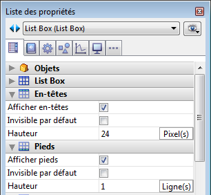Hauteur : permet de définir la hauteur de la ligne d’en-tête et de la ligne de pied de la list box. Vous pouvez choisir l’unité (lignes ou pixels) de la valeur de hauteur. Pour plus d'informations sur ce point, reportez-vous au paragraphe Hauteur en pixels ou en lignes ci-dessous. Par défaut, la hauteur des en-têtes et des pieds est de 1 ligne. Attention : la hauteur minimum en pixels des en-têtes dépend du système. Si vous passez une valeur trop petite, elle sera remplacée par la taille minimum définie dans le système pour les en-têtes. Il n’y a pas de taille minimum pour les pieds et les lignes. Note de compatibilité : Sous Windows 7 et Windows Vista, la hauteur minimale des en-têtes est de 24 pixels. Les en-têtes de hauteur inférieure éventuellement définis dans vos bases converties seront automatiquement redimensionnés. Dans ce cas, il vous sera peut-être nécessaire de retoucher vos formulaires.