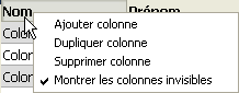La propriété Invisible, lorsqu’elle est cochée, permet de rendre la colonne invisible dans le mode Application. En mode Développement, vous avez la possibilité d’afficher ou de masquer les colonnes déclarées invisibles à l’aide du menu contextuel associé à la list box :