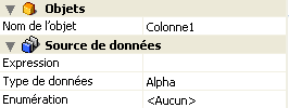 Type de données (list box de type sélection) : ce menu permet de définir le type de l’expression ou de la variable associée à la colonne. Elle est utilisée pour déterminer le format d’affichage à appliquer et permet de mettre à jour le menu Type d’affichage dans le thème “Affichage”. Si un champ est saisi dans la zone Expression, la propriété Type de données n’est pas affichée, le format d’affichage correspond dans ce cas au type du champ.