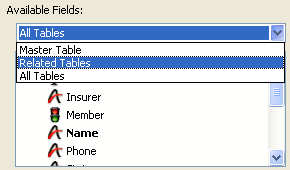 Available Fields menu: This menu allows you to select the table or tables from which you want to display fields in the Fields list. You can display fields from the Master table, the Related tables, or All tables.