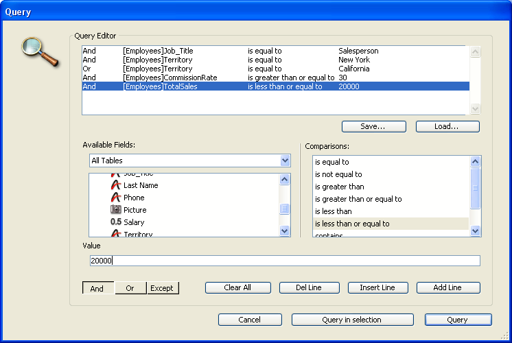 The conjunction operators let you create compound queries such as “Find the salespeople in New York or California and who have commission rates in excess of 30 per cent and who had sales volume less than $20,000.” The figure below shows this query being specified in the Query editor: