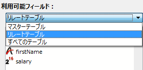 - 利用可能フィールドメニュー: このメニューを使用し、フィールドリストに表示したいフィールドが属すテーブルを選択することができます。マスターテーブル、リレートテーブルまたはすべてのテーブルからフィールドを表示できます。