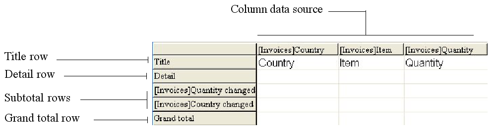 クイックレポートフォームにおいて、テキストの追加や修正を行い、レポートの各部分にラベルを設定することができます。例えば、合計計算を実行する場合、小計行や総計行の他のセルにテキストを追加することにより、合計計算のラベルを設定することができます。次のように、テキストを追加、または修正することができます: